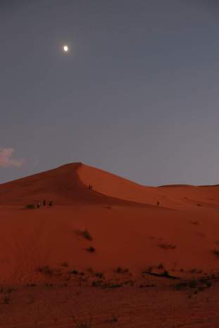 We watch in awe as the fiery orb in the sky slowly collides into the saffron sands of the Sahara desert. As the sun merges with the earth, its molten sunlight reflects off the sands and is amplified back into the sky to reveal glorious hues of red, yellow, orange, pink, blue, and even violet. We are left breathless … mostly because of the climb but also because of this spectacular moment. Here we stand, teetering on a thin crest of a sand dune, the size of a small mountain, in Morocco! Life IS good! Once the last flame fizzles out, we continue to stare into the evening twilight, as if expecting the sun to reappear, until Youssef finally announces that it’s suppertime.